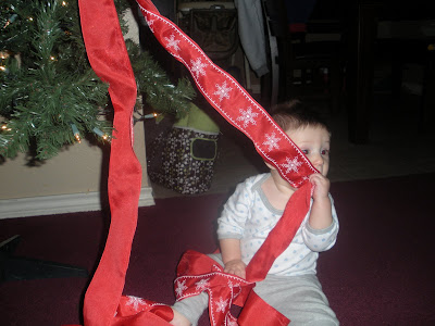 And here is the beginning of our tree decorating....Warren wanted to unravel the ribbon and lick it.
